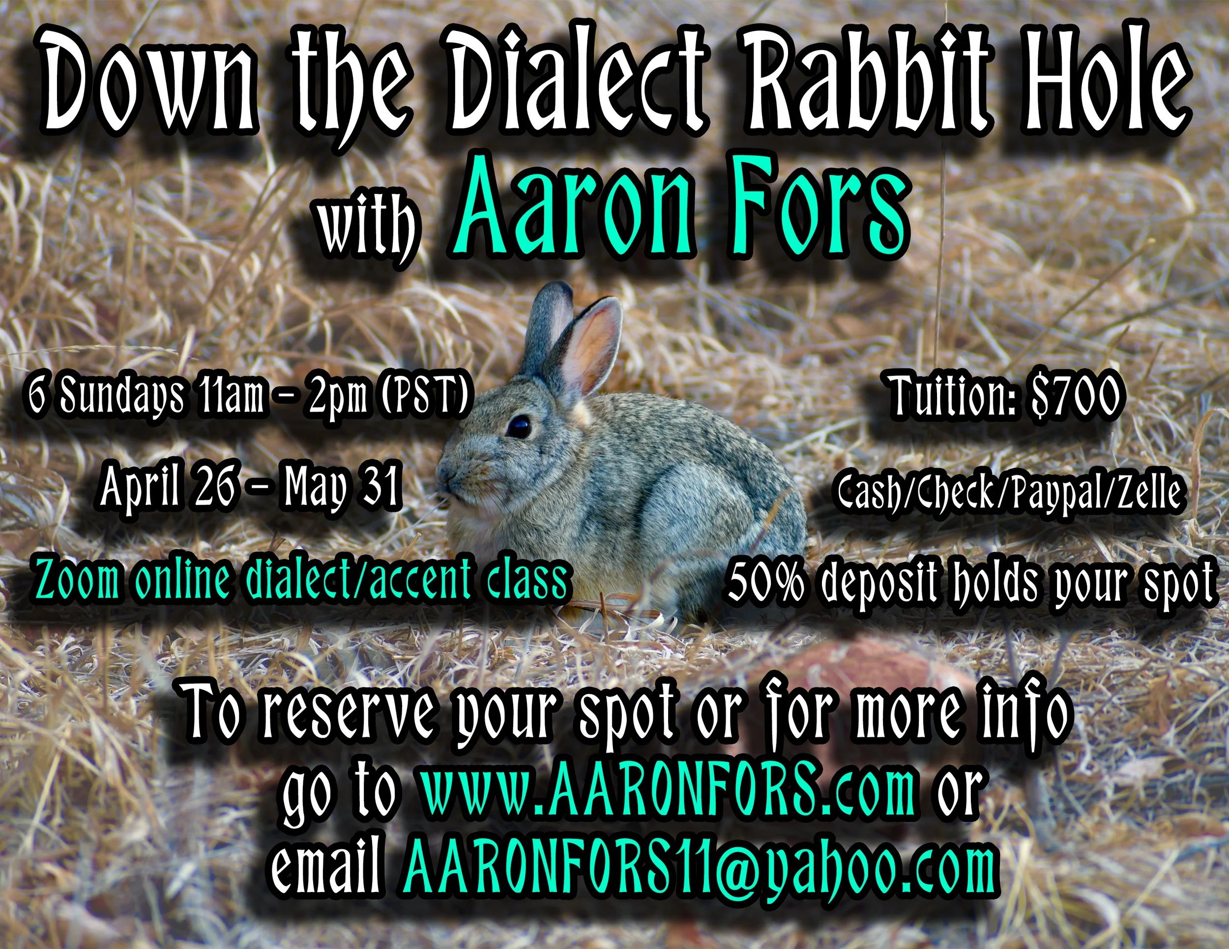 • Tuition: $700 [cash/check/paypal/zelle] 50% deposit holds your spot.